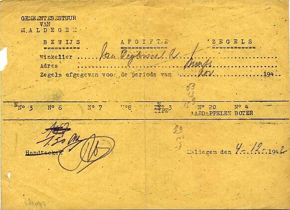 Ontvangstbewijs voor de afgifte van zegels voor aardappelen en boter aan een winkelier, opgesteld door het Gemeentebestuur van Maldegen.