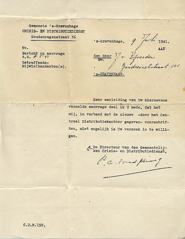 Document van de Crisis- en Distributiedienst waarin een aanvraag van Rijwielbandenbon(s) is afgewezen.<br><br><br>