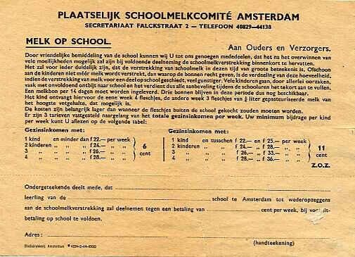 Een ongebruikt aanvraagformulier voor schoolmelk van het 'Plaatselijk Schoolmelkcomité' te Amsterdam.