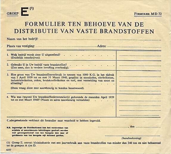 Enkelzijdig gedrukt blanco formulier ten behoeve van de distributie van vaste brandstoffen.<br><br><br><br>