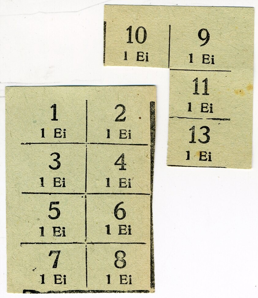 Twee restanten van groene bonnenvellen voor eieren met genummerde bonnen.