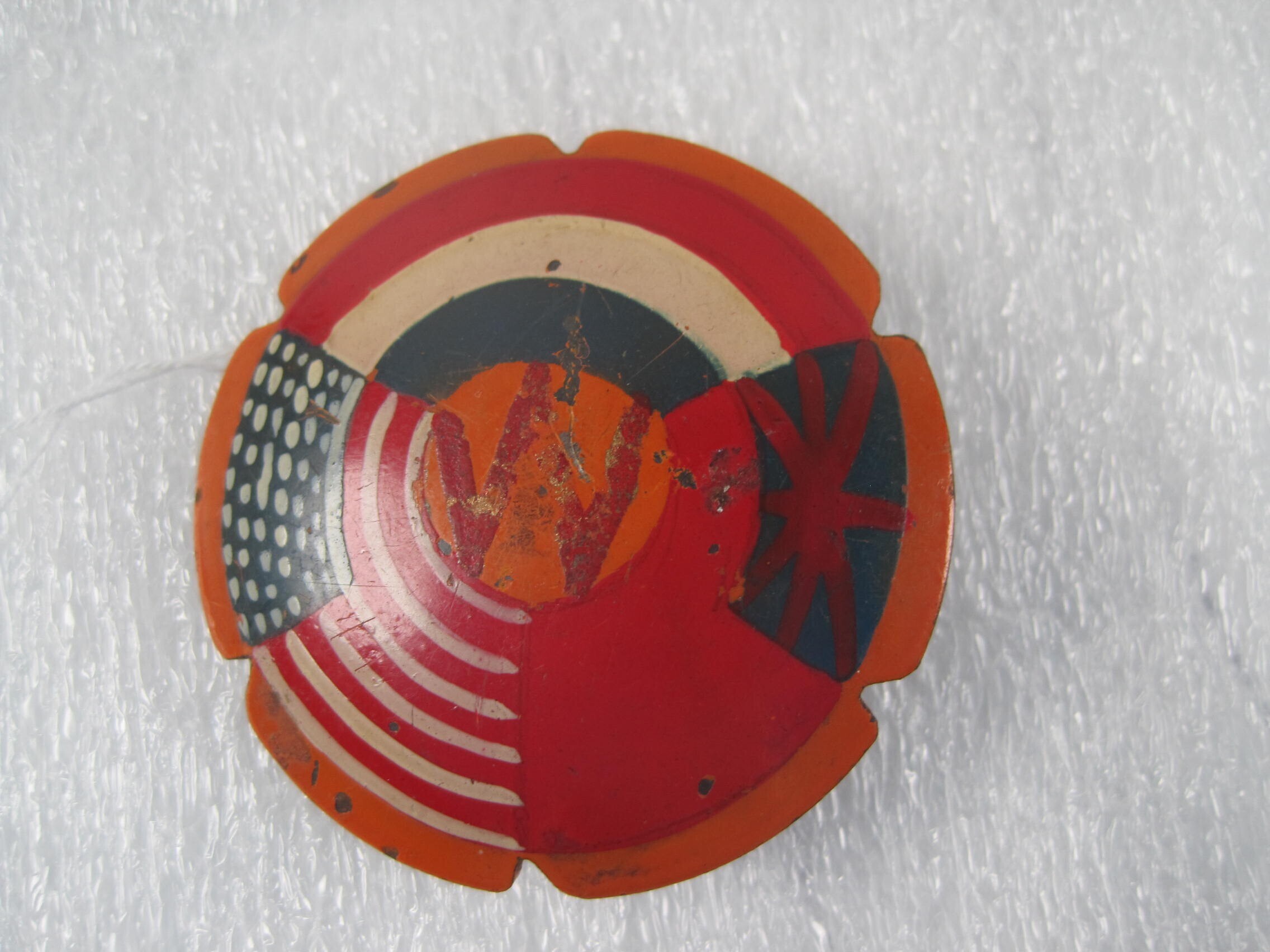 Een ter gelegenheid van de bevrijding zelfgemaakte koperen bolvormige broche beschilderd met delen v...