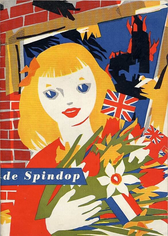 Editie van 'De Spindop', personeelsblad van Enka. Het betreft het lente/bevrijdingsnummer waarin 10 jaar bevrijding wordt herdacht. Het nummer verscheen op donderdag 5 mei 1955. Het personeelsblad is geïllustreerd met kleurenfoto's en omvat 41 pagina’s. Op de kaft een kleurentekening van een meisje met een boeket bloemen met vlaggetjes met op de achtergrond een brandende stad.