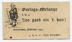 Los reclamekaartje voor tabak met als opschrift: ''Oorlogs-Melange, d.w.z. Zoo goed als 't Kan!'', Rotterdam, februari 1941, van J.& A.C.van Rossem. Met als illustratie een man in zeventiende eeuws kostuum.