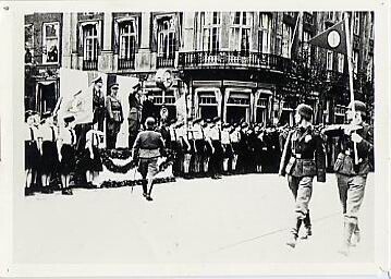 Een zwart-wit foto genomen ter hoogte van de Plaats van de parade bij het vertrek van Nederlandse Vrijwilligers op 11 oktober 1941 vanuit Den Haag.