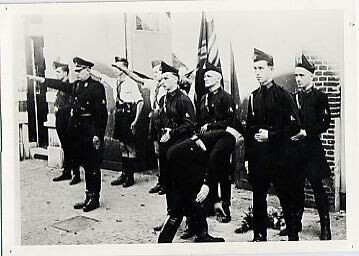 Een zwart-wit foto van een eerbetoon van jonge en oudere NSB'ers in vol ornaat bij een kranslegging.<br>