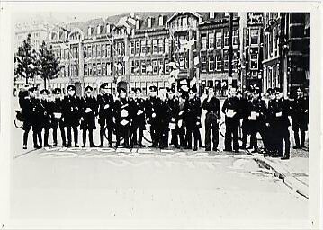 Een zwart-wit foto van een rij poserende NSB'ers op de Hofweg in Den Haag met uit de lucht neer dwarrelende pamfletten. Zij staan achter de op straat gekalkte leus: "Victorie Duitsland Wint!".<br><br>