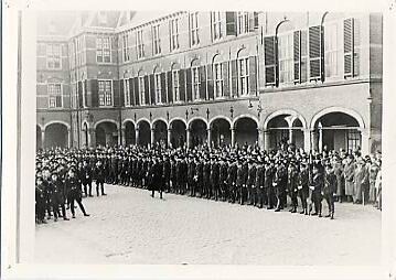 Een zwart-wit foto van op het Binnenhof te Den Haag opgestelde geüniformeerde NSB'ers met toeschouwers.<br>