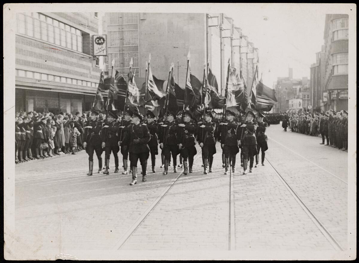 Marcherende NSB’ers in vol ornaat met vlaggen, toeschouwers aan weerszijden van de Grote Marktstraat in de binnenstad van Den Haag.
