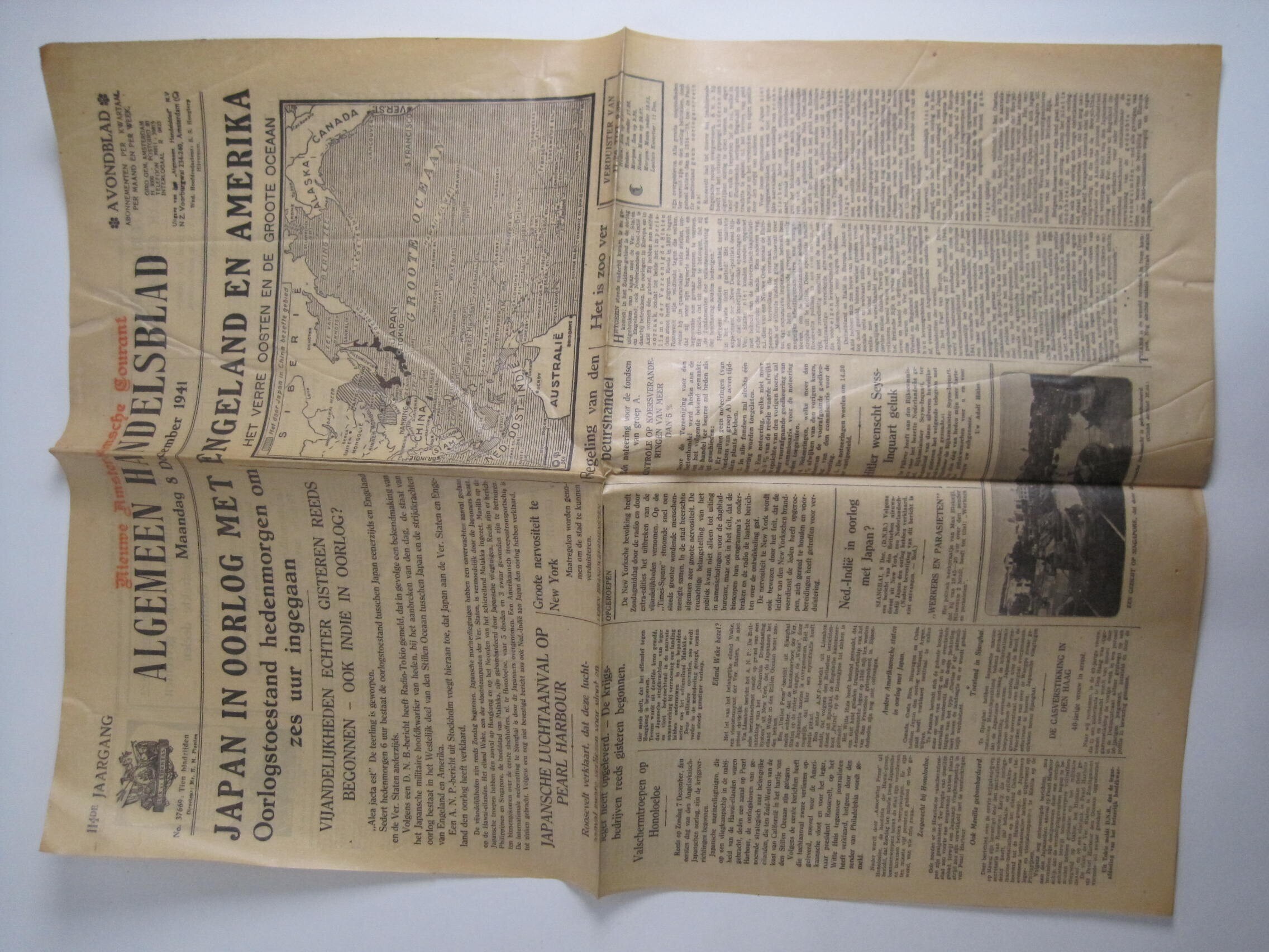 Een exemplaar van het Algemeen Handelsblad, 114e jaargang van 8 december 1941 over de luchtaanval op Pearl Harbour. Japan in oorlog met Engeland en de VS.