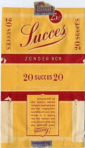 Opengevouwen sigarettenverpakking van "Succes" - surrogaat - sigaretten. De verpakking heeft nog een gedeelde gescheurde blauwgrijze sluitzegel met "succes"