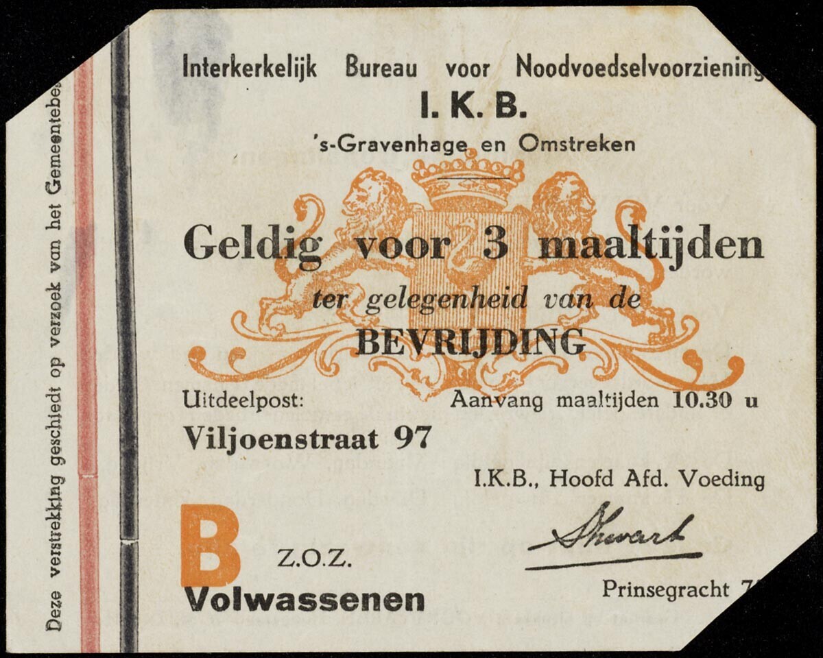 zes maaltijdbonnen van het Interkerkelijk Bureau voor Noodvoedselvoorziening ter gelegenheid van de bevrijding. De bonnen zijn goed voor drie maaltijden.