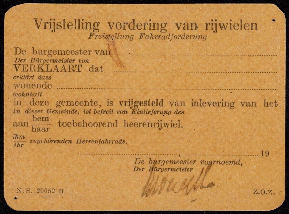 Nog niet ingevulde kaart voor vrijstelling van rijwielen met stempel van de burgemeester. En een ingevulde kaart afgegeven in de gemeente Leersum.