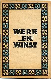 Twee exemplaren van de uitgave 'Werk en winst'. Dit boekje is geïllustreerd met tekeningen in kleurendruk van arbeiders uit verschillende bedrijfstakken. De voorkant is omkaderd met een rand van gestileerde blauwe en witte bloemen. Het is een uitgave van het Nederlandsche Arbeidsfront signatuur over de rol van de arbeider in een krachtig en verenigd Europa.