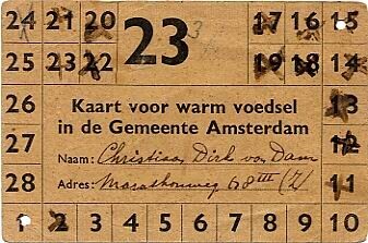 Kaart voor warm voedsel in de gemeente Amsterdam op naam van C.D. van Dam. Op de kaart staan 23 vakken waarvan een aantal doorgekruist.