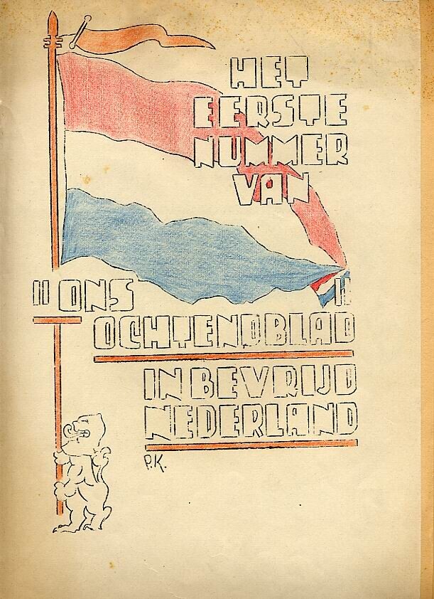 Eerste nummer van "Ons ochtendblad voor bevrijd Nederland''. De uitgave omvat negen aan aan elkaar geniete getypte dubbelzijdige stencils. In een bijlage wordt aangegeven dat de van oorsprong illegale uitgave van dit blad voorlopg nog te laten verschijnen totdat een ''grote'' krant de taken heeft overgenomen.