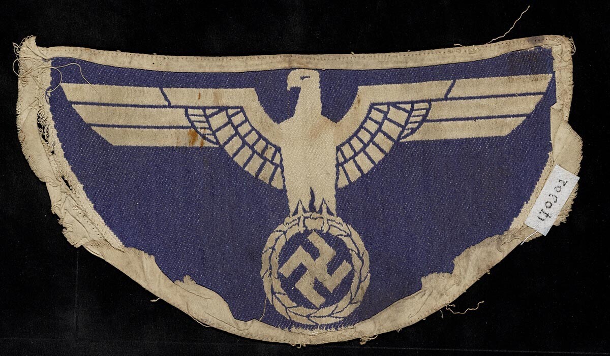 Een katoenen halfrond embleem van de Wehrmacht met in wit op een blauwe achtergrond een gestileerde rijksadelaar met gespreide vleugels en in de klauwen het hakenkruis. Op de achterkant de kleuren precies andersom.