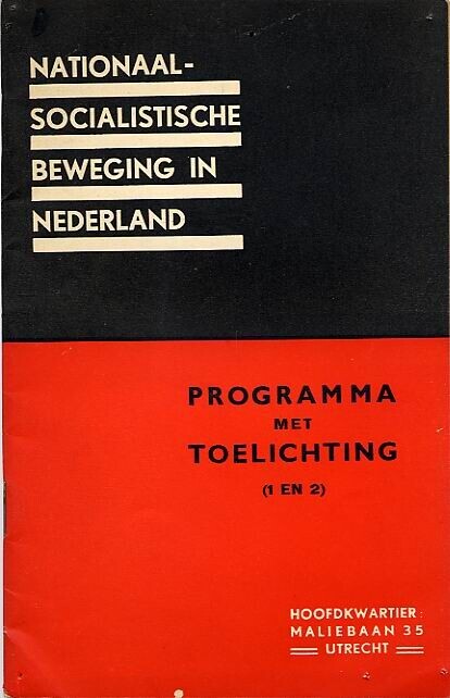 Drie uitgaven van de Nationaal Socialistische Beweging in Nederland (N.S.B.): Programma en Toelichting (1 en 2); Nationaal-socialistische (Fascistische) staatsleer no. 3; Brochure V. Staatkundige richtlijnen.