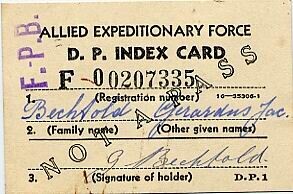 Een "D.P. (Displaced Persons) Index card" op naam van Gerardus Jac. Bechtold afgegeven door de "Allied Expeditionary Force" afgestempeld "F.P.B." Op de achterkant staat onder andere de tekst: "Keep this card at all times to assist your safe return home."
