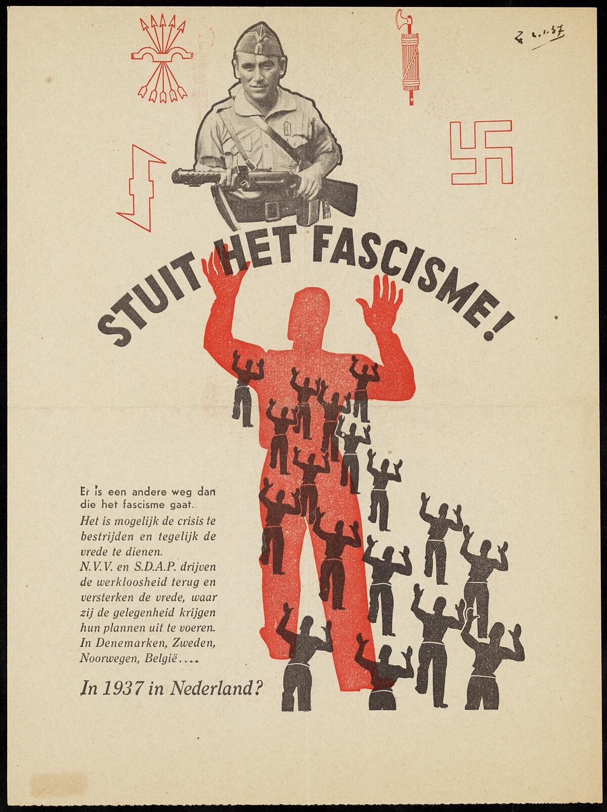 Pamflet tegen het fascisme met in rode en zwarte opdruk op de voorkant een militair met geweer tussen symbolen van het Fascisme. Hieronder rode en zwarte figuren met de armen opgeheven.