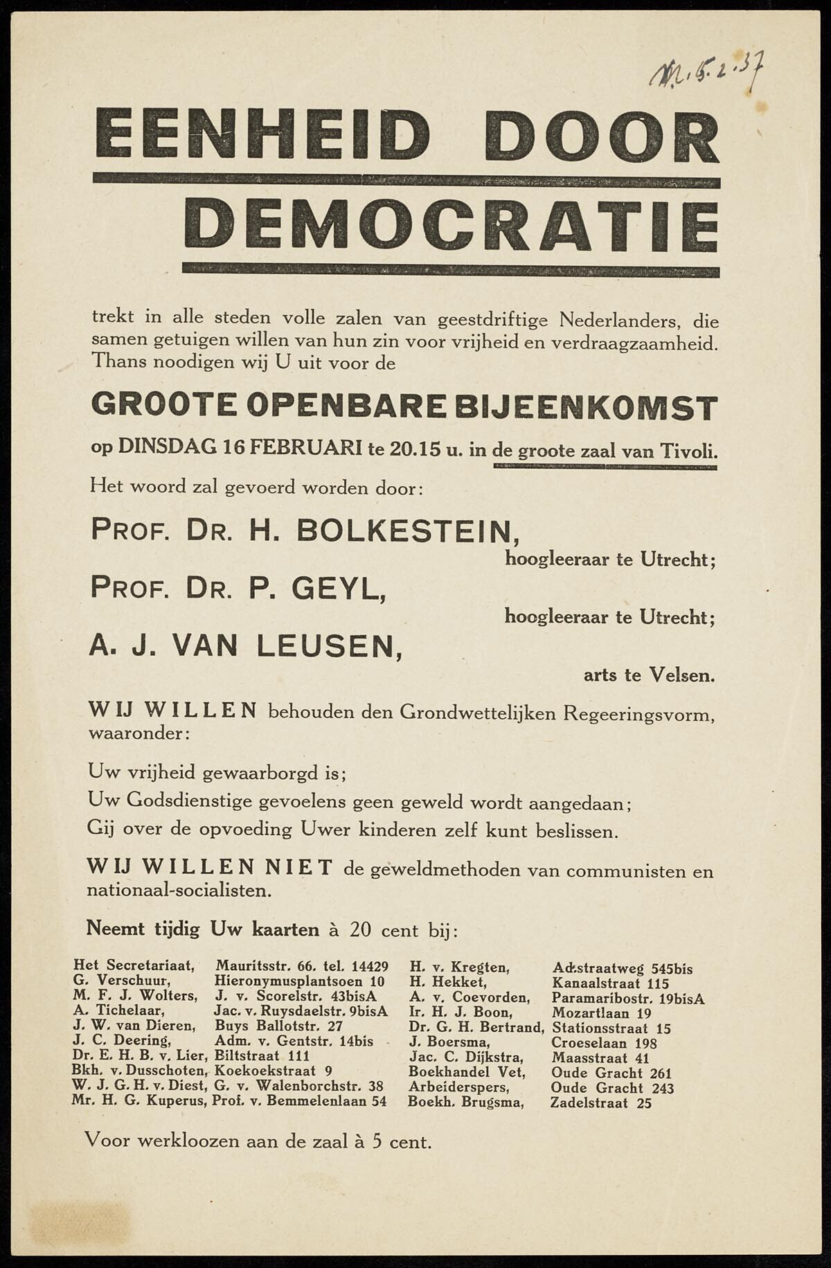 Pamflet voor een 'groote openbare bijeenkomst' van de Nederlandsche Beweging voor Eenheid door Democratie.