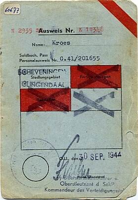 Blauwe 'ausweis' uitgegeven op naam van de heer Kroes voor het betreden van "Spergebiet": Scheveningen en Clingendaal voorzien van met stempels .