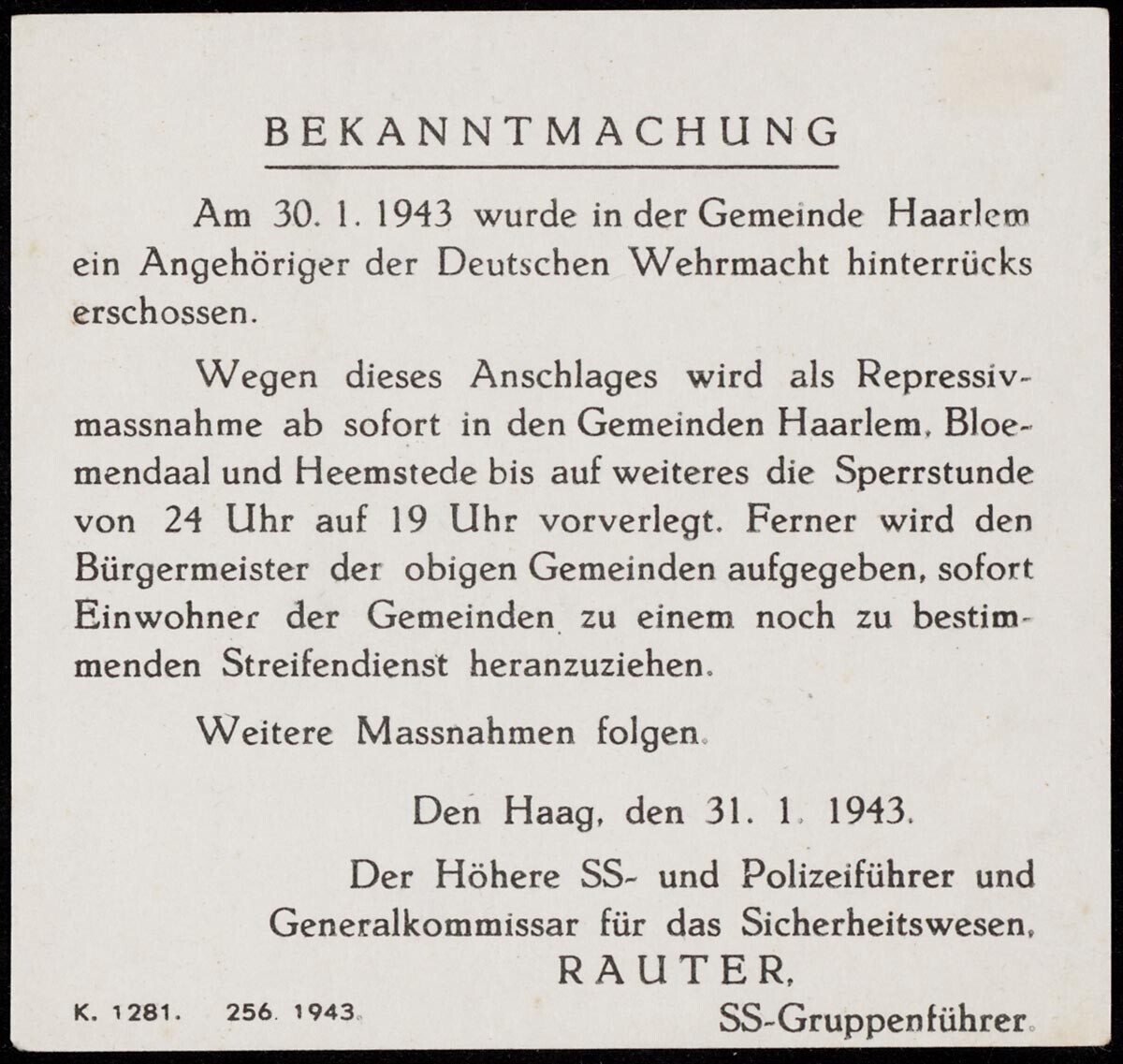 Duitstalige bekendmaking van de instelling van een avondklok als gevolg van de aanslag op een lid van de Wehrmacht.