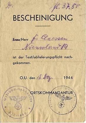 Bevestiging van de "Textielablieferungspflicht" 1944. Met twee stempels van de Ortskommandantur te Alkmaar.