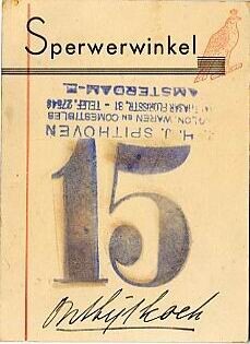 Kaart van de Sperwerwinkel. Op de voorzijde een stempel van het adres van een winkel in Amsterdam en stempel van het cijfer 15. Met de hand is het woord ''Ontbijtkoek'' op de kaart geschreven. Op de achterzijde een datumstempel: 24 sept. 1943.