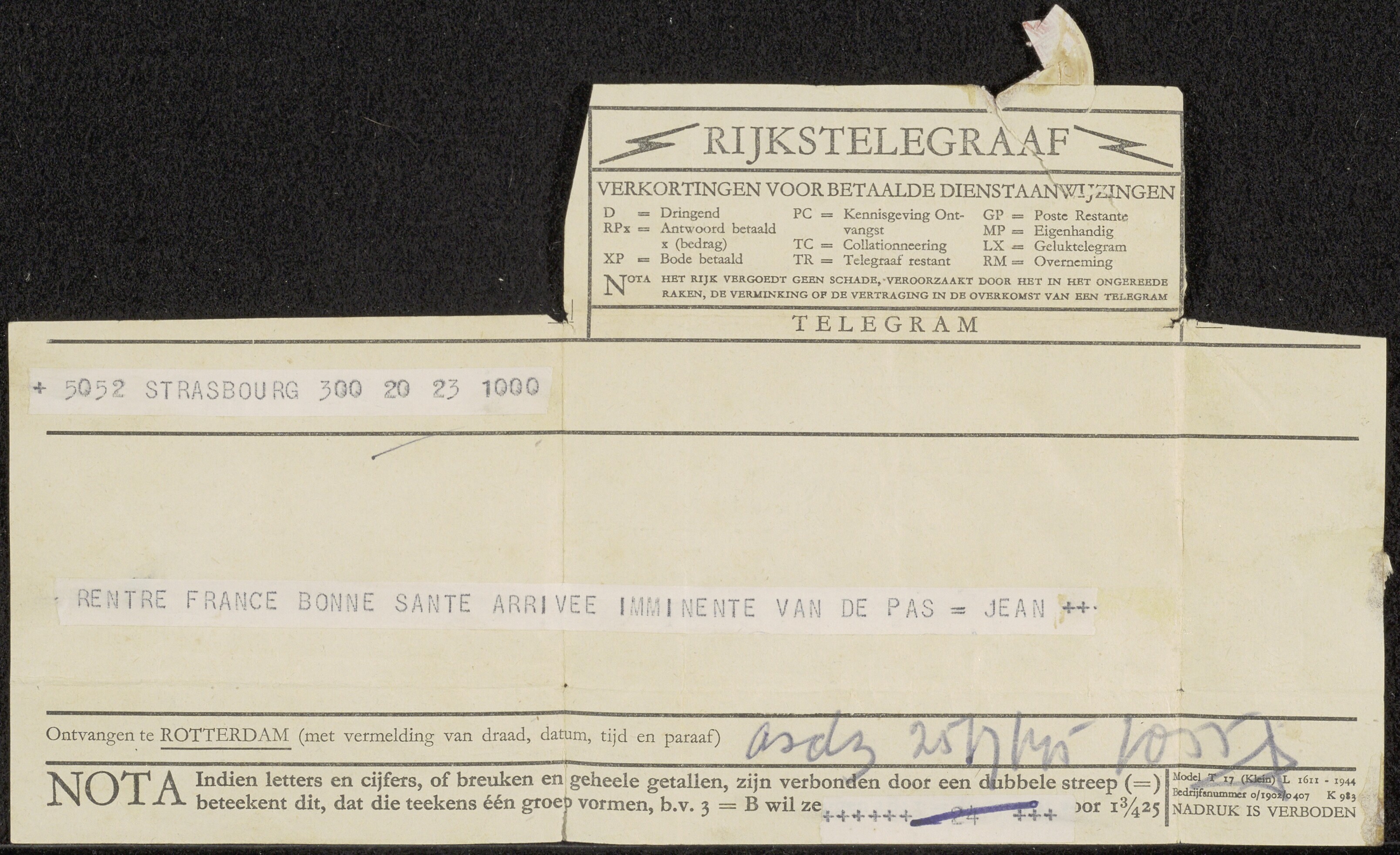 Telegram van de heer J. van de Pas met betrekking tot zijn tewerkstelling in Duitsland.