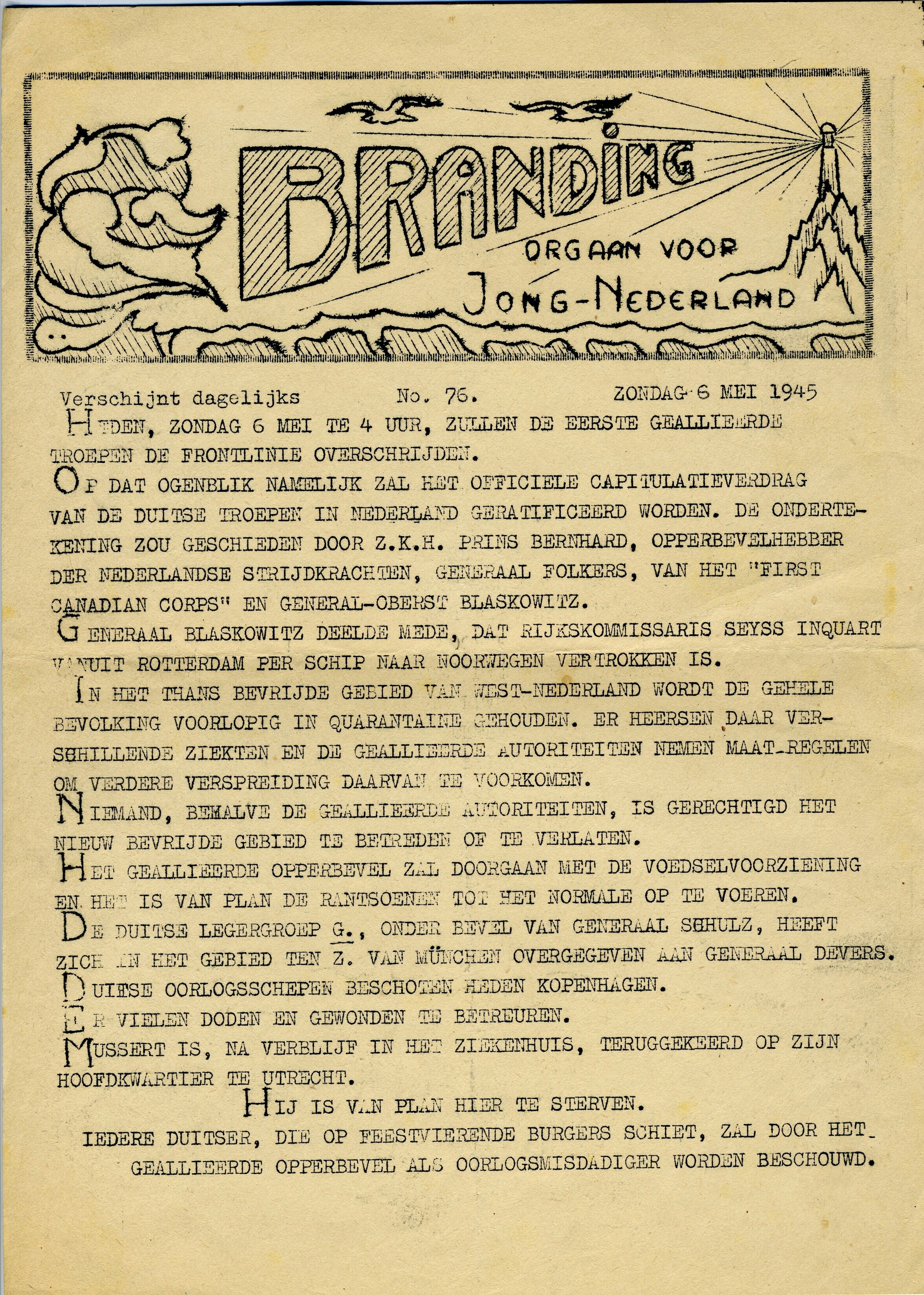 Branding, orgaan voor jong Nederland, nummer 76. In dit nummer van 6 mei 1945 wordt de ratificatie van het officiële capitulatieverdrag aangekondigd.