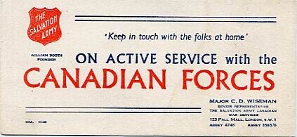 Visitekaartje van Major C.D. Wiseman van het Canadese Leger des Heils. Het visitekaartje is wit met blauwe en rode opdruk. In de linker bovenhoek het wapen van "The Salvation Army".