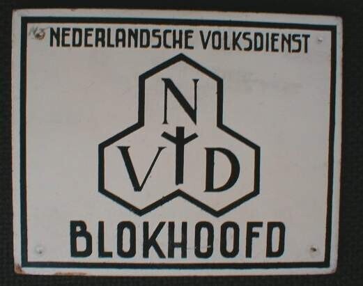 Kartonnen bordje van de Nederlandsche Volksdienst met daarop het logo van de "Nederlandsche Volksdienst" en de functie: "Blokhoofd".