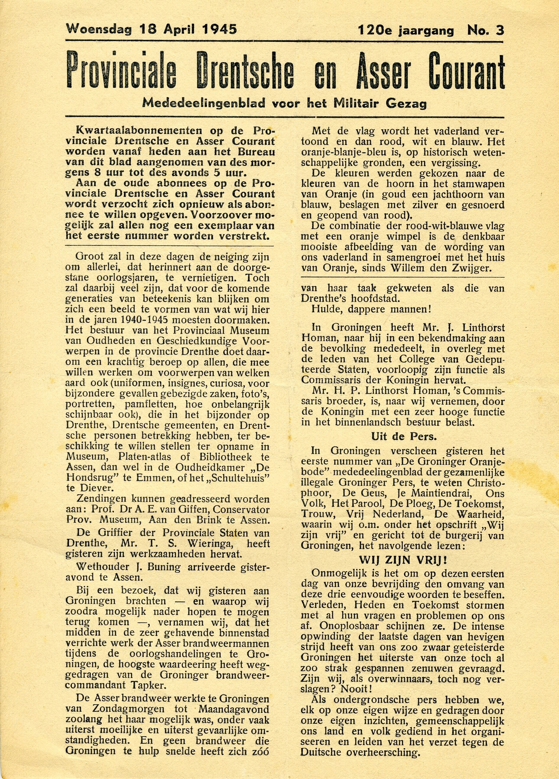 Zestien exemplaren van de "Provinciale Drentsche en Asser Courant" van de 120ste jaargang uit de periode 17 april (nummer 2) tot en met 11 mei 1945 (nummer 21). De nummers hebben diverse maten en zijn enkel- of dubbelbladig. <br>