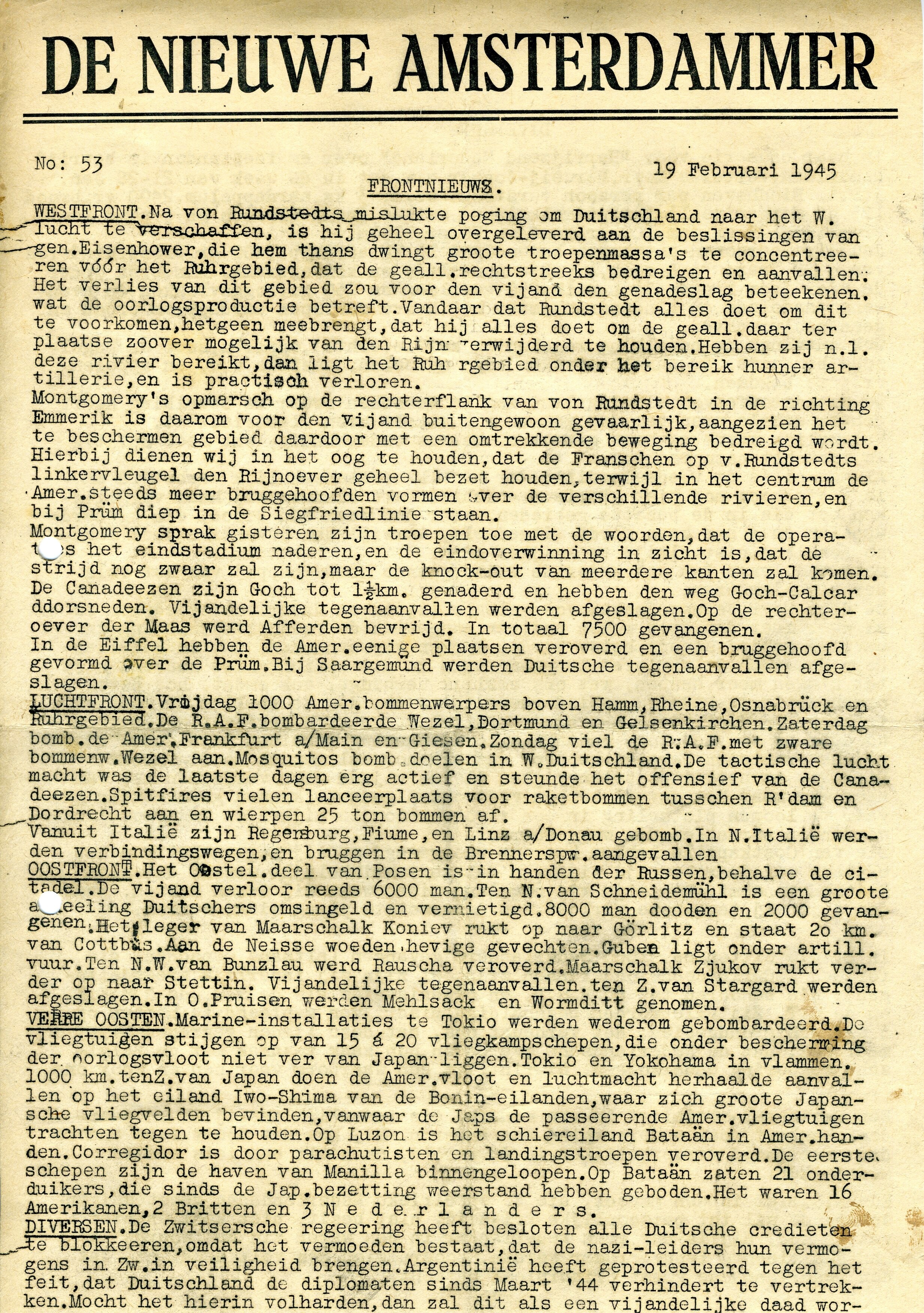 Gestencilde uitgave van het verzetsblad "De Nieuwe Amsterdammer". Het betreft nummer 52 van 19 februari 1945 met "Frontnieuws".<br><br><br><br>