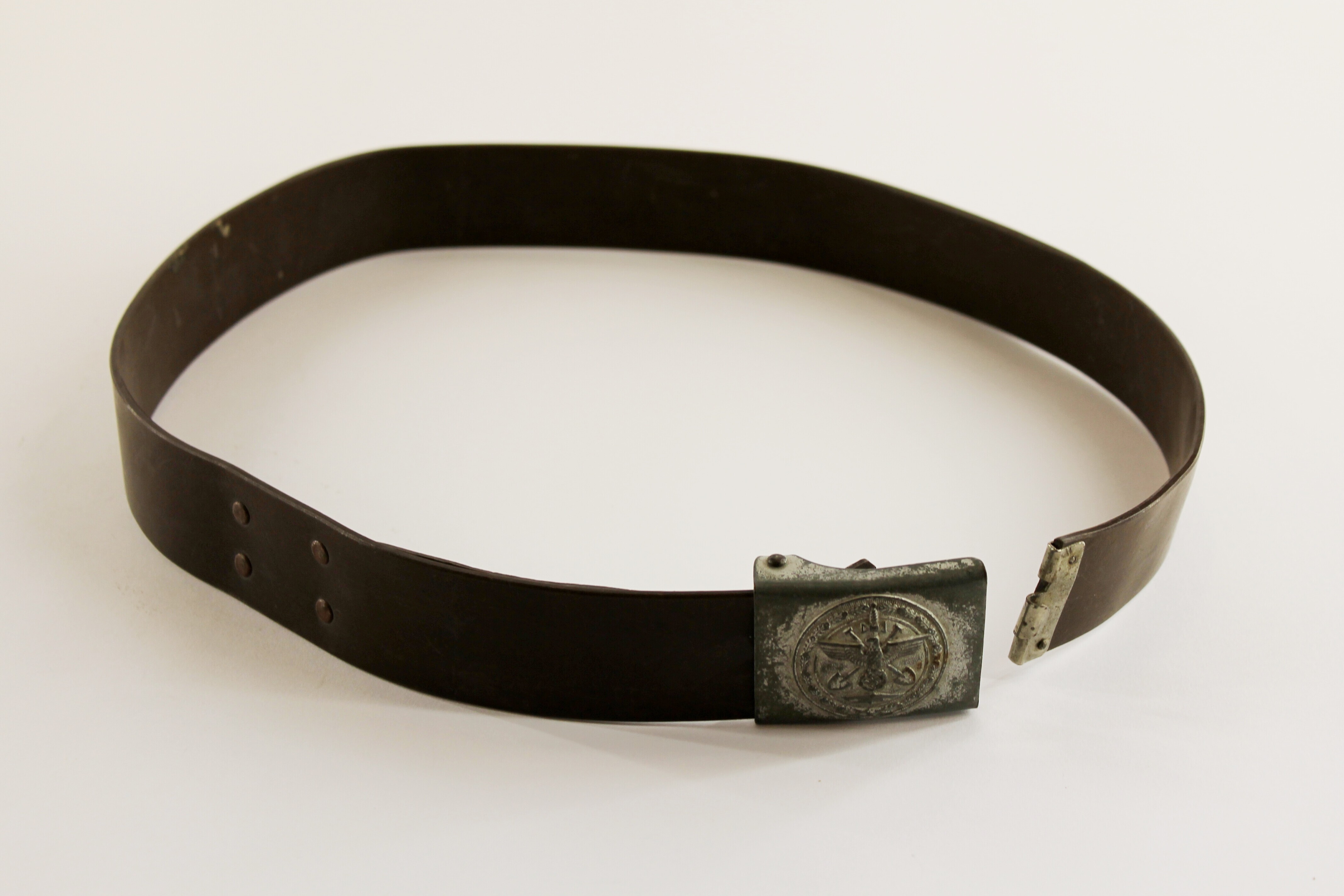 Een bruin leren koppelriem met aan een uiteinde een ijzeren haakje. Aan het andere uiteinde is het metalen koppelslot vastgeklemd. Op het koppelslot in een medaillon met een rand van eikenbladeren het embleem van de Oranisation Todt: twee gekruiste schoppen met in het midden een ontbloot zwaard met daarop de Duitse Rijksadelaar met in de klauwen het hakenkruis boven het dak van een bunker.