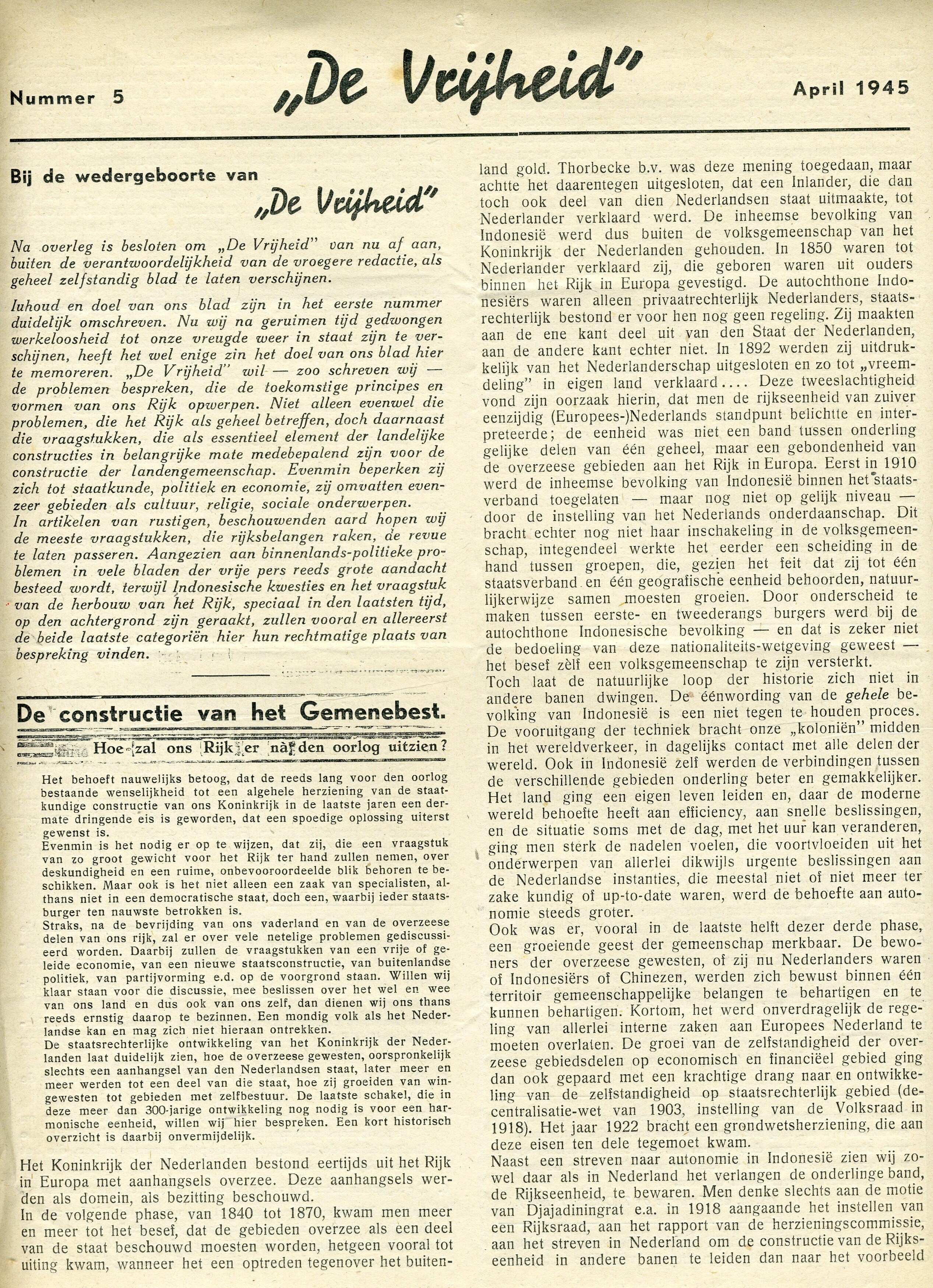 Editie nummer 5 van ''De Vrijheid" van april 1945. De verzetskrant omvat vier pagina's waarin aandacht wordt besteed aan de toekomst van het Koninkrijk.