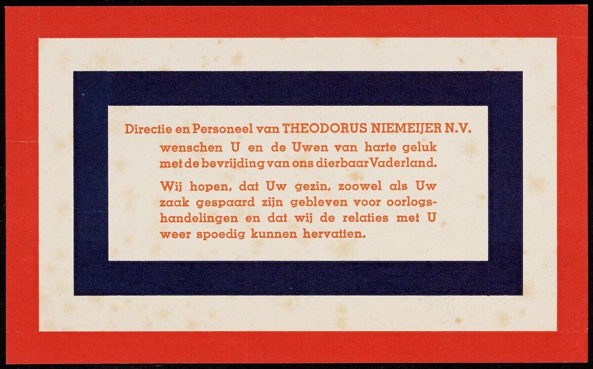 Een kaart in de kleuren van de Nederlandse vlag. Directie en personeel van Theodorus Niemeijer N.V. wensen geluk met de bevrijding.