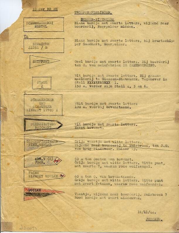 Getypt document met de omschrijving van het ontwerp van aanwijzingsborden. Gedateerd op 16 november 1944, ondertekend door Jodokus.