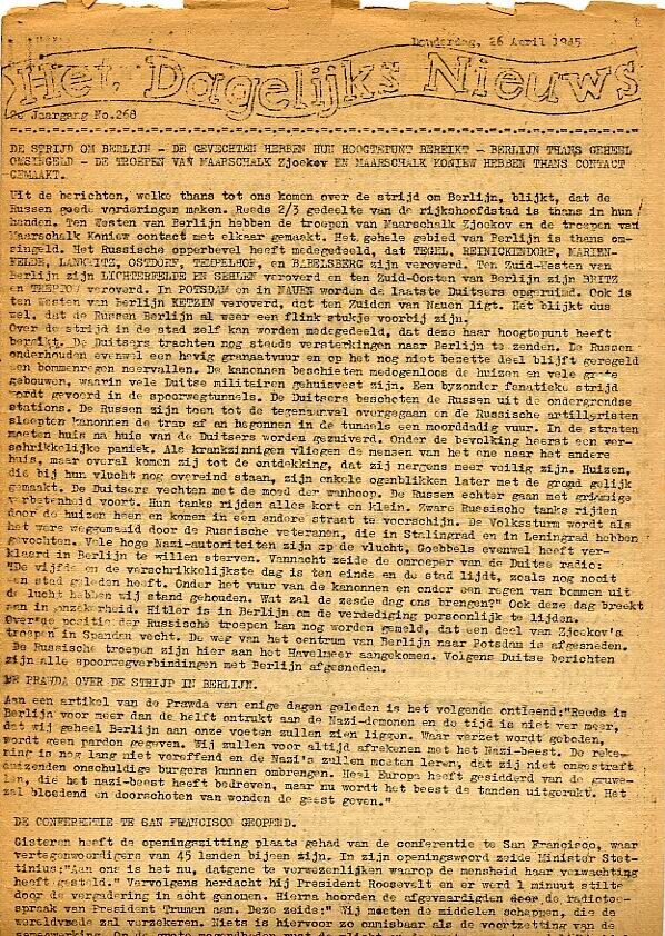 Twee exemplaren uit de tweede jaargang van "Het Dagelijkse Nieuws" van donderdag 26 april (nummer 268) en woensdag 2 mei (nummer 273). De uitgaven zijn dubbelzijdig getypte stencils met berichten over onder andere de strijd om Berlijn en de dood van Hitler.<br><br><br><br><br>
