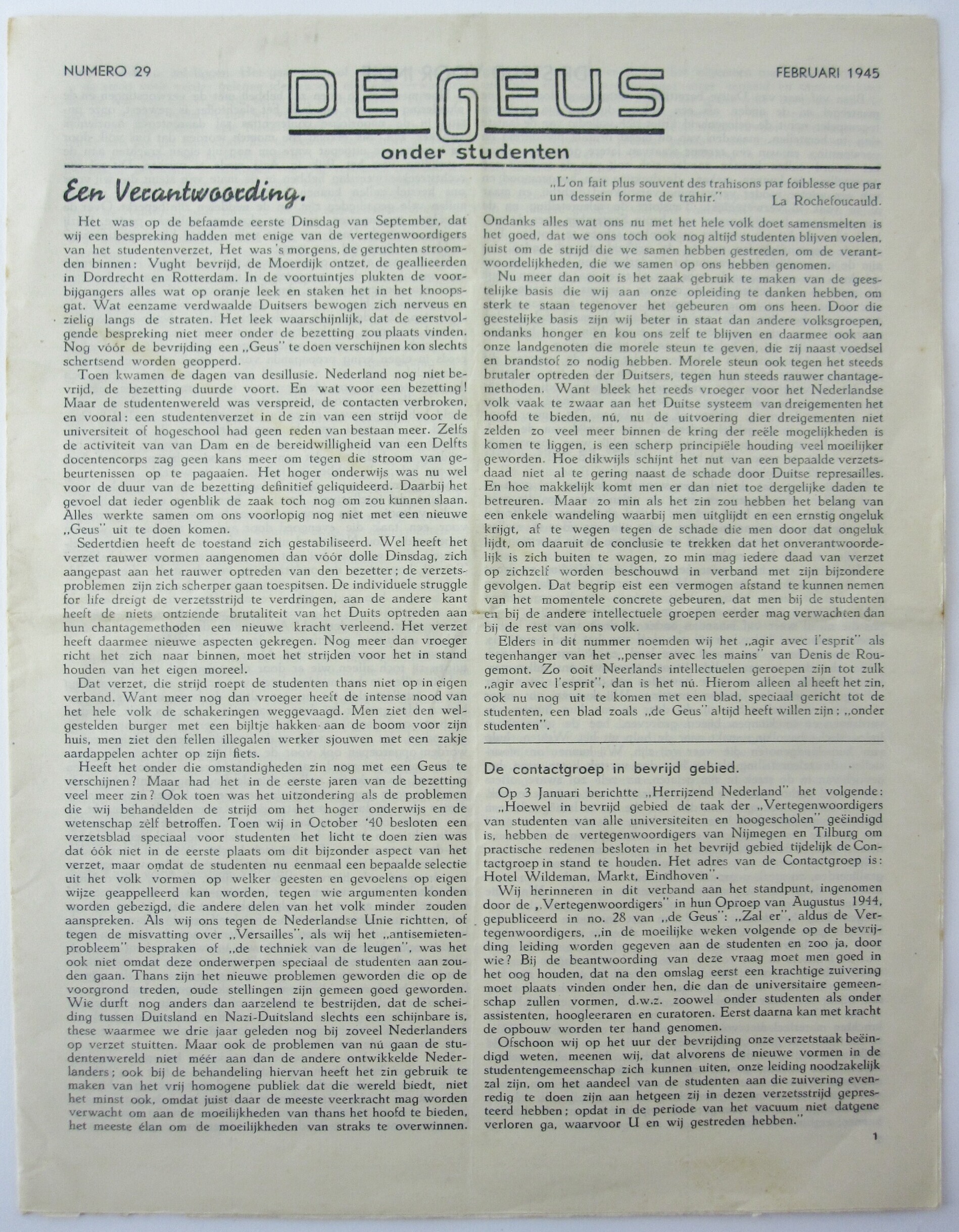 Studentenblad: "De Geus" onder studenten. Exemplaar nummer 29 van februari 1945. In acht pagina's worden onderwerpen behandeld ober de komende studentengeneratie en de eenheid in de studentenwereld. Bijgevoegd is een stencil met een ''Geus-enquête"<br><br><br><br><br><br><br><br><br>