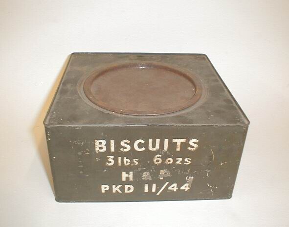 Legergroen blik met rond deksel. Op het blik in witte sjabloonletters: "Biscuits 3 lbs 6 ozs H & P PKD 11/44". Waarschijnlijk door Amerikaanse vliegtuigen in april/mei 1945 boven Nederland gedropt.