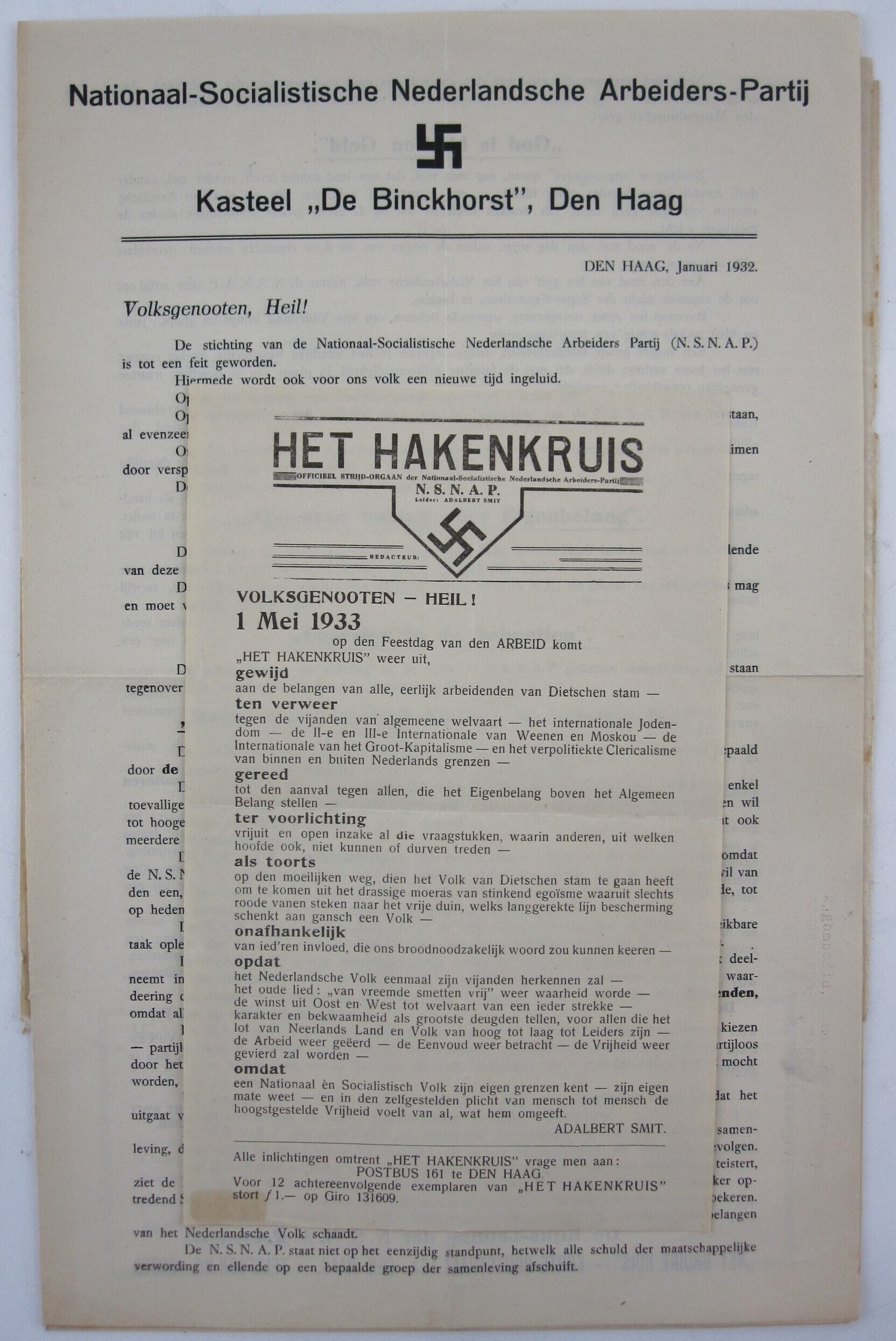 Drie versies van het programma van de Nationaal-Socialistische Nederlandsche Arbeiders Partij (N.S.N.A.P.) van januari 1932. De aanmeldstroken voor het lidmaatschap van de partij ontbreken bij twee exemplaren. Deze zijn langs de geperforeerde rand afgescheurd. Daarbij een exemplaar van ''Het Hakenkruis'', het officieel strijd-orgaan van de partij, van 1 mei 1933.