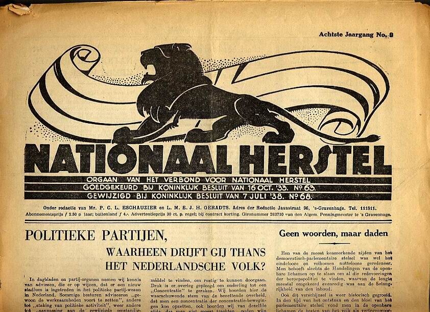 Drie exemplaren van Nationaal Herstel. Het betreft de nummers de eerste jaargang No. 7. juli 1933; de derde jaargang No. 10. 10 mei 1935 en de achste jaargang No. 9. zonder datering, wel wordt hier als actueel thema de Nederlandsche Unie genoemd (1940-1941).