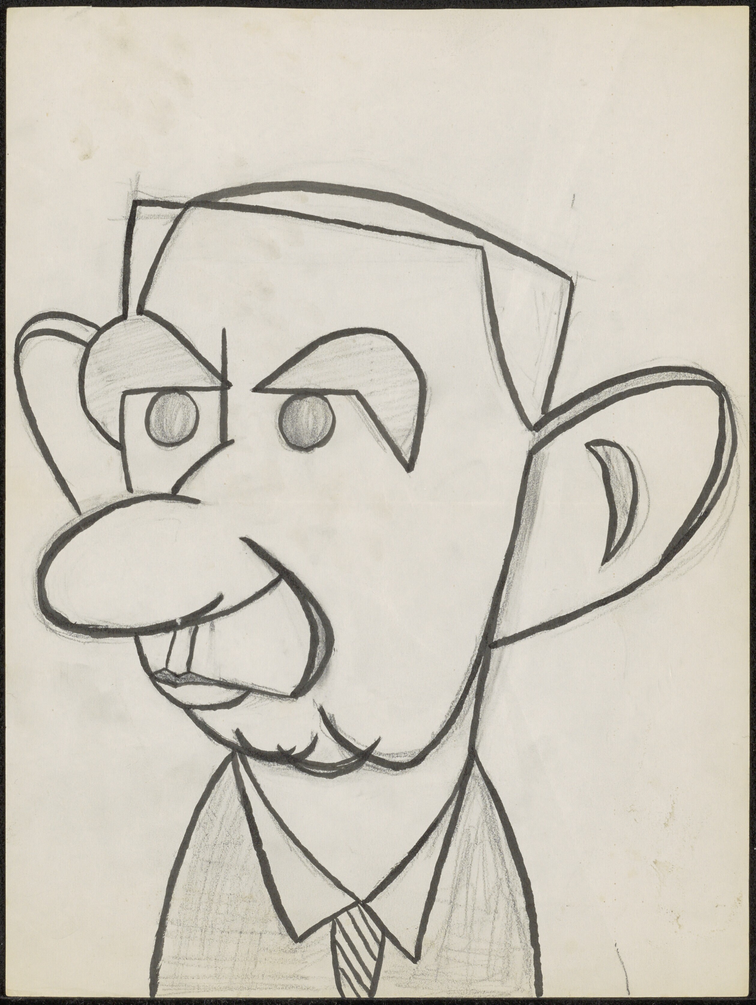 Zwartwit tekening met een karikatuur van J.H. Scheps.<br>