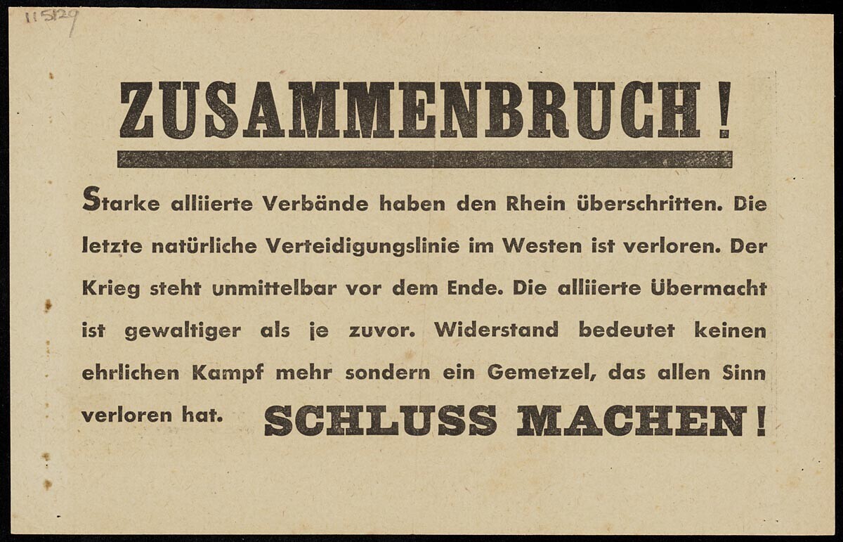 Geallieerd (Duitstalig) pamflet waarin Duitse soldaten worden opgeroepen om de strijd te staken. Op de achterzijde wordt aangegeven op welke manier men zich dient over te geven.