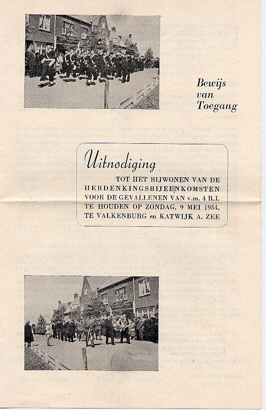 Enveloppe met een uitnodiging tot het bijwonen van een herdenkingsbijeenkomst van de Vereniging van Oudstrijders. De uitnodiging bevat het programma voor zondag 9 mei 1954. Er zijn enkele consumptiebonnen die uit de uitnodiging gescheurd kunnen worden.