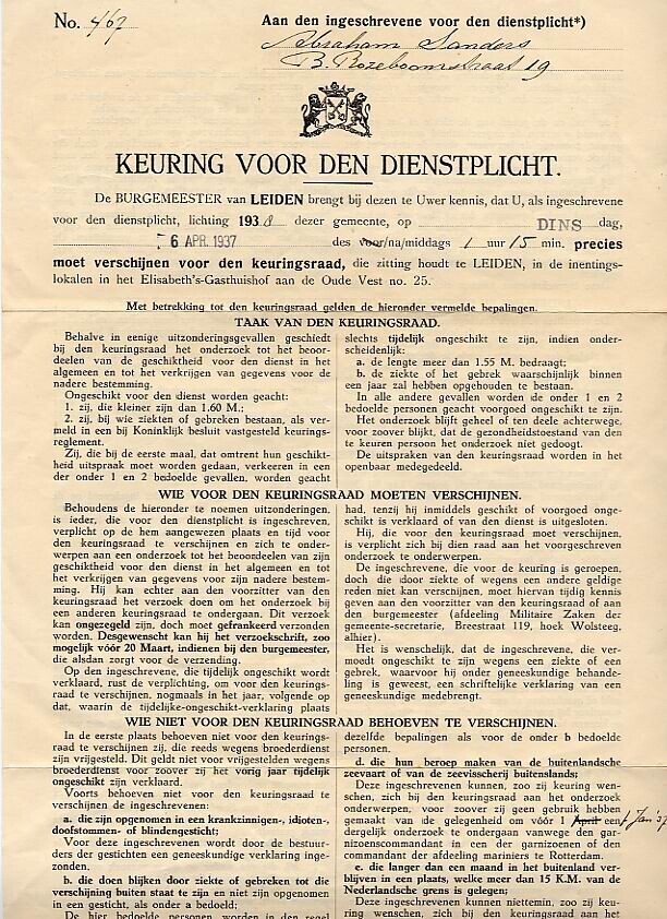 Oproep ter keuring voor de dienstplicht van Abraham Sanders.