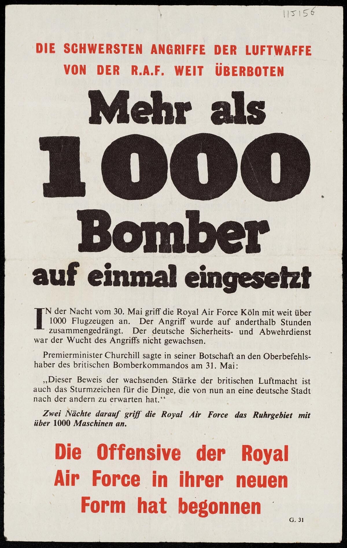 Geallieerd (Duitstalig) pamflet waarin het bombardement van Keulen op 30 mei 1942 wordt aangehaald als voorbeeld van het nieuwe offensief van de Royal Air Force. Op de achterzijde van het pamflet worden de Duitsers opgeroepen om zichzelf van Hitlers regime te bevrijden.