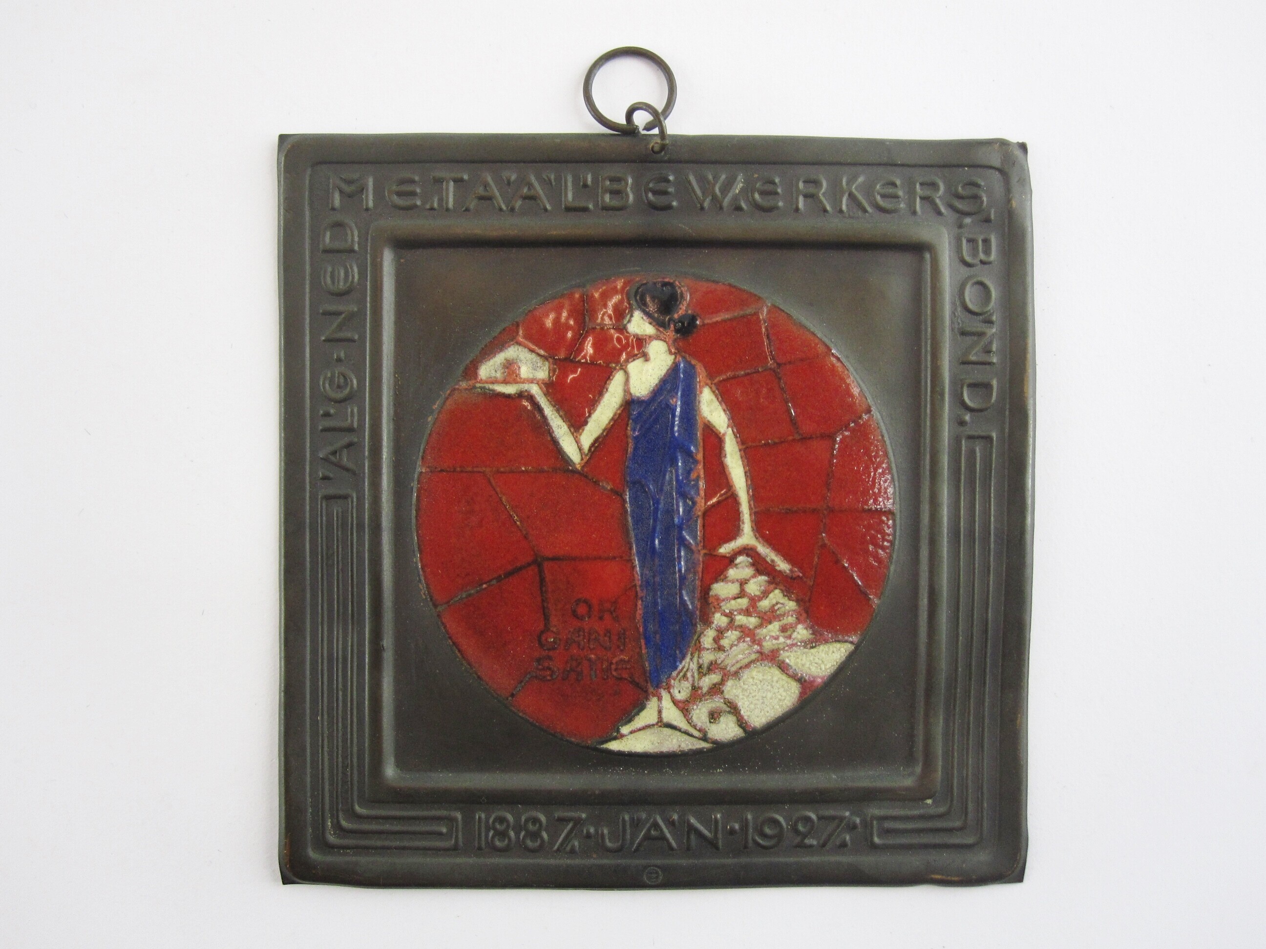 Een vierkante van een bruine laag voorziene messing 'tegel' ter viering van het 40-jarig jubileum van de 'Algemene Nederlandse Metaalbewerkersbond'. In het midden is op een rond vlak dat verdeeld is in onregelmatige segmenten met email een voorstelling aangebracht van een vrouw in blauw klassiek gewaad staand tegen een rode achtergrond met in haar linker opgeheven hand een huis en met haar rechter hand naar beneden gericht boven een berg. Links van haar: "Organisatie". Langs de rand staat in een verhoogd kader en versierd met een geometrisch motief: "Alg. Ned. Metaalbewerkersbond 1887 - Jan - 1927". Geheel onderaan een monogram dat staat voor de ontwerper: Jan Eisenloeffel. Bovenaan is een ophangring bevestigd van hetzelfde metaal.